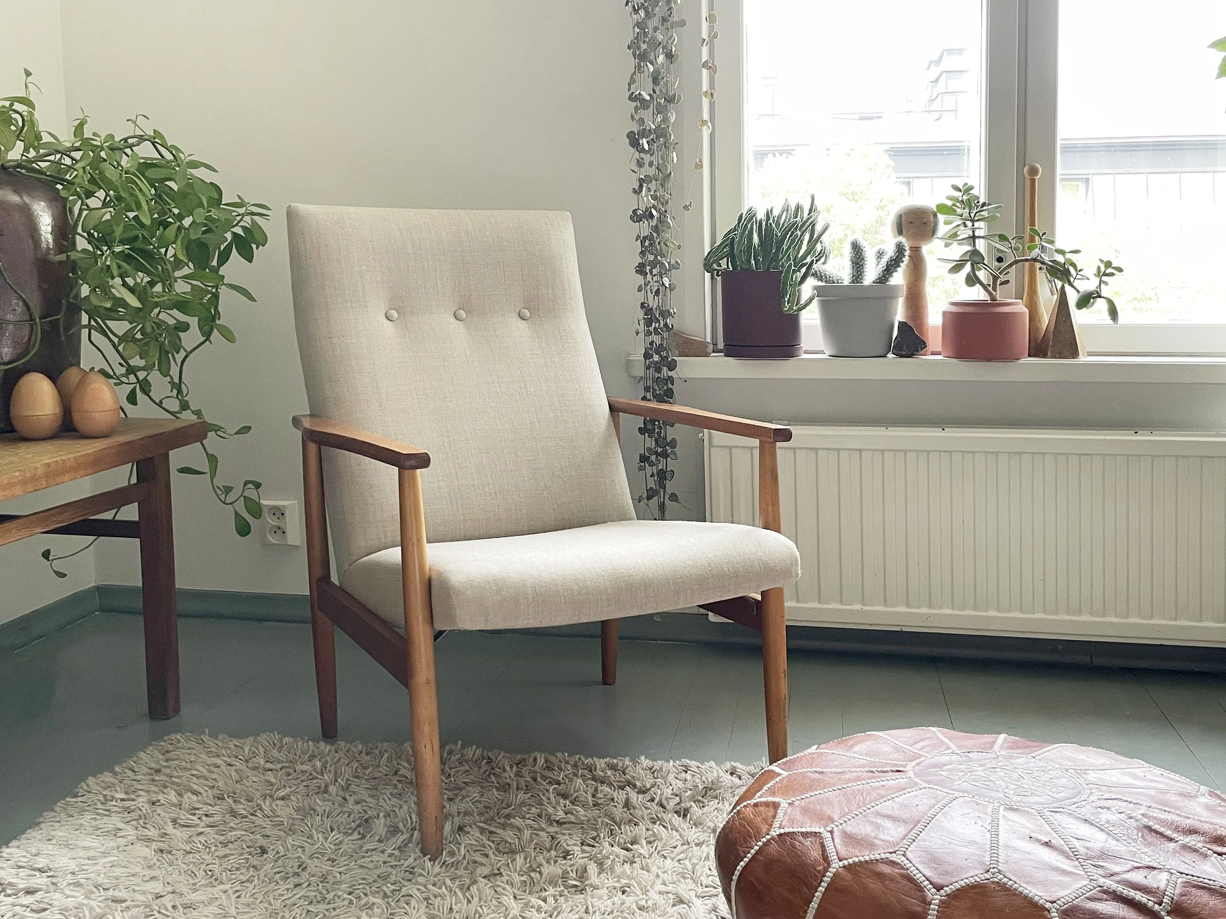 Liisin kunnostama 50-luvun nojatuoli, jonka pehmusteet uusittu ja tuoli on uudelleenverhoiltu Annalan Yolo Loud-kankaalla.